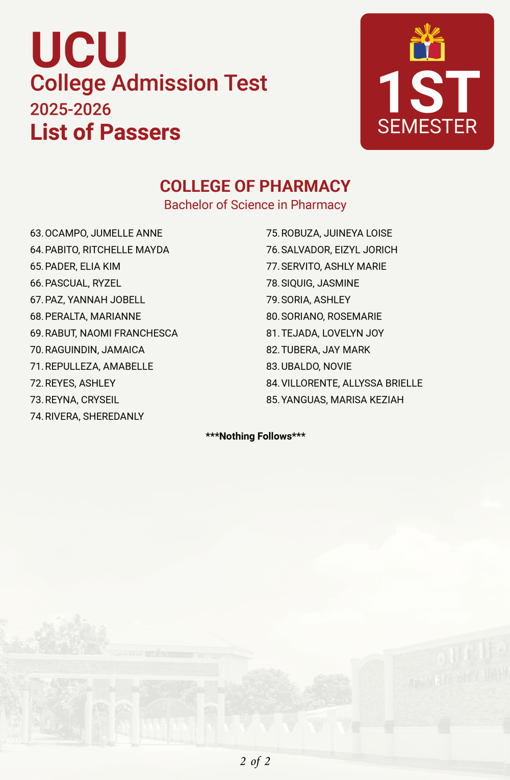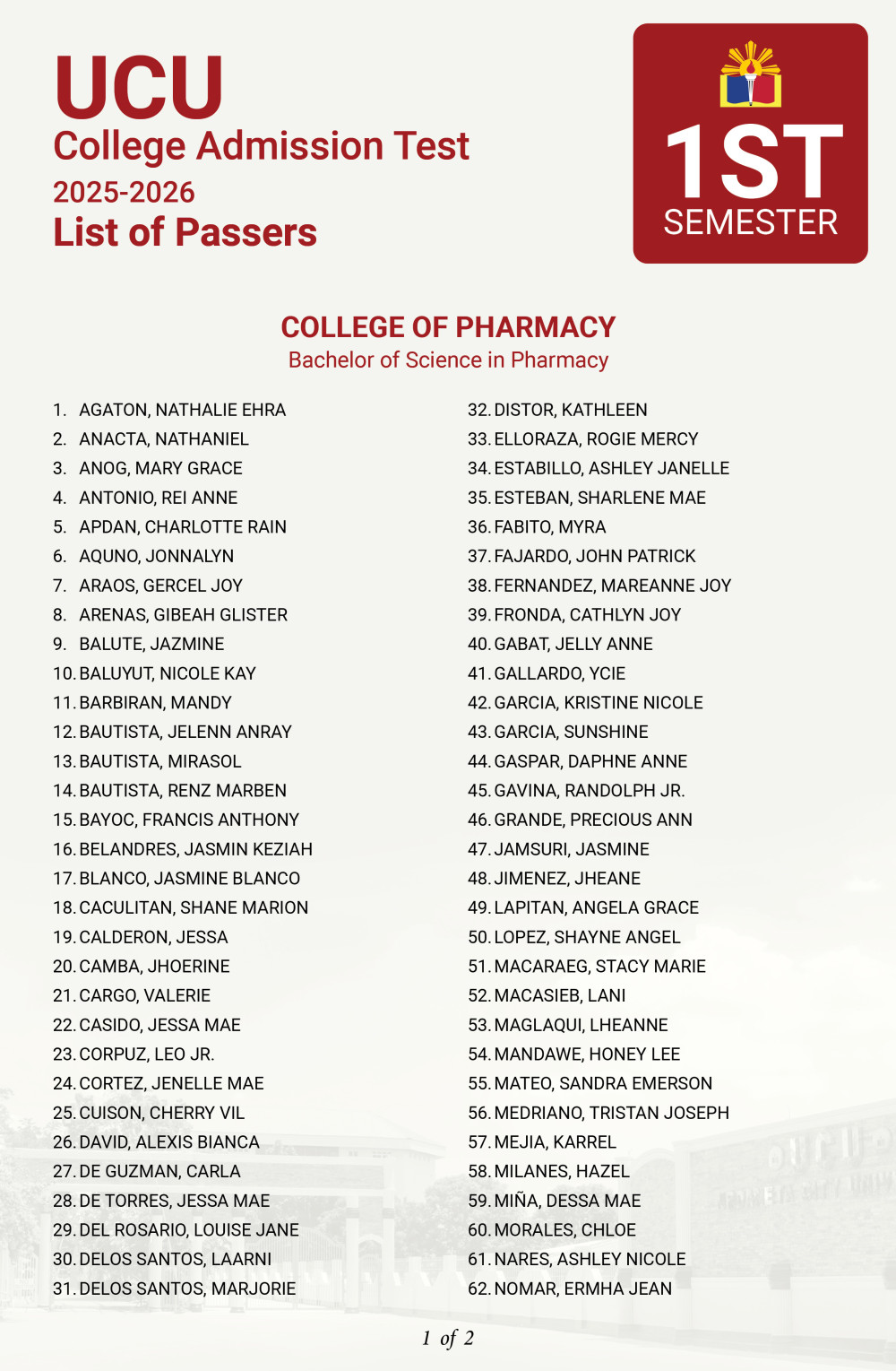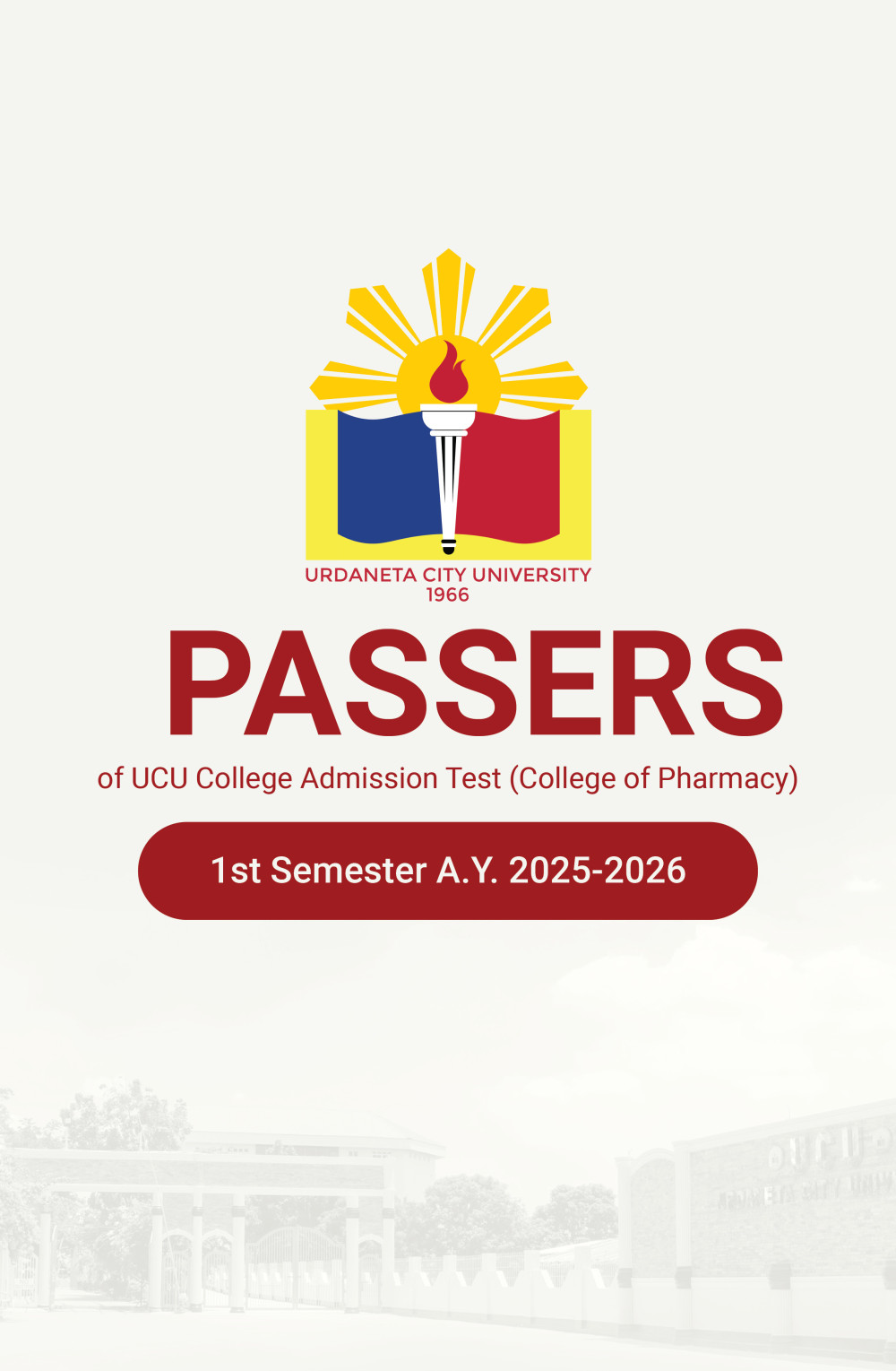 TO ALL EXAMINEES under the 𝗕𝗔𝗖𝗛𝗘𝗟𝗢𝗥 𝗢𝗙 𝗦𝗖𝗜𝗘𝗡𝗖𝗘 𝗜𝗡 𝗣𝗛𝗔𝗥𝗠𝗔𝗖𝗬 program– here is the 𝗟𝗶𝘀𝘁 𝗼𝗳 𝗣𝗮𝘀𝘀𝗲𝗿𝘀 for the 𝗨𝗖𝗨 𝗖𝗼𝗹𝗹𝗲𝗴𝗲 𝗔𝗱𝗺𝗶𝘀𝘀𝗶𝗼𝗻 𝗧𝗲𝘀𝘁 (𝗖𝗔𝗧), 𝗙𝗶𝗿𝘀𝘁 𝗦𝗲𝗺𝗲𝘀𝘁𝗲𝗿 𝗔.𝗬. 𝟮𝟬𝟮𝟱-𝟮𝟬𝟮𝟲.