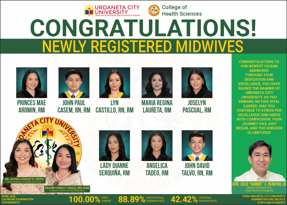 Urdaneta City University is one in celebration with the College of Health Sciences - Midwifery Department for the remarkable achievement of its passers in the April 2026 Midwives Licensure Examination.