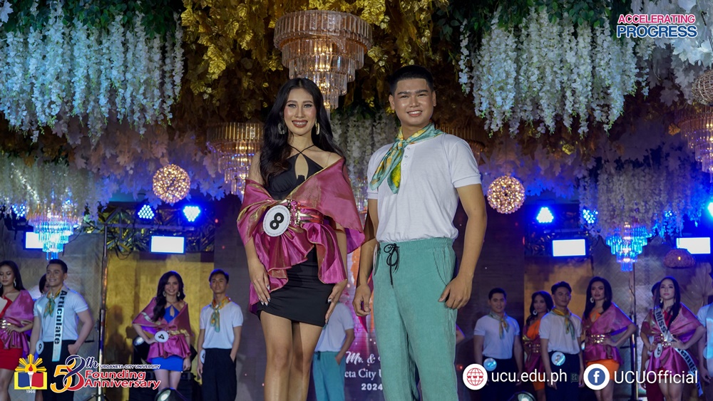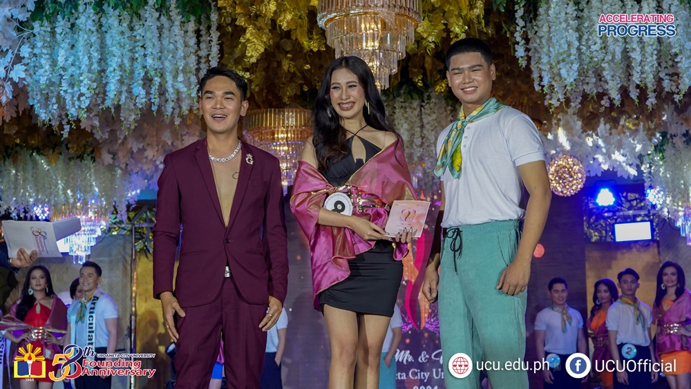 Out of ten contenders for men and women categories , Jazien C. Abuan of the College of Business Management and Accountancy (CBMA) and Irene D. Co from the College of Engineering and Architecture (CEA) were crowned as Mr. and Ms. Urdaneta City University 2024.