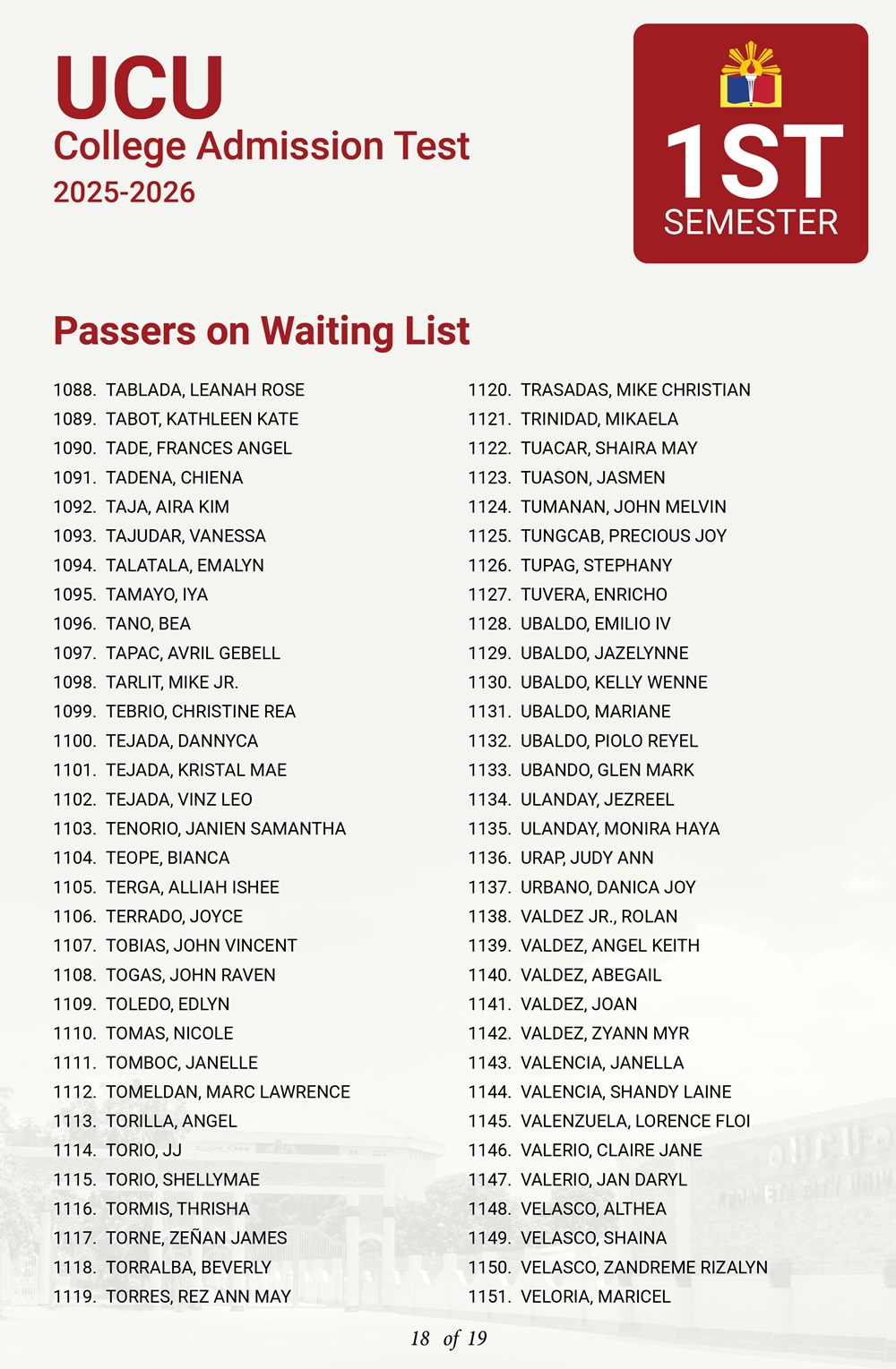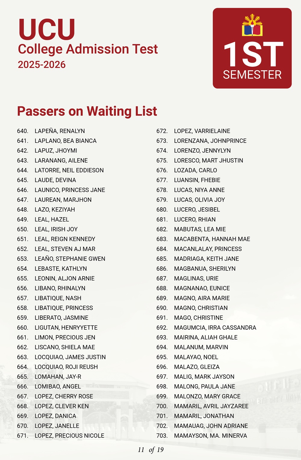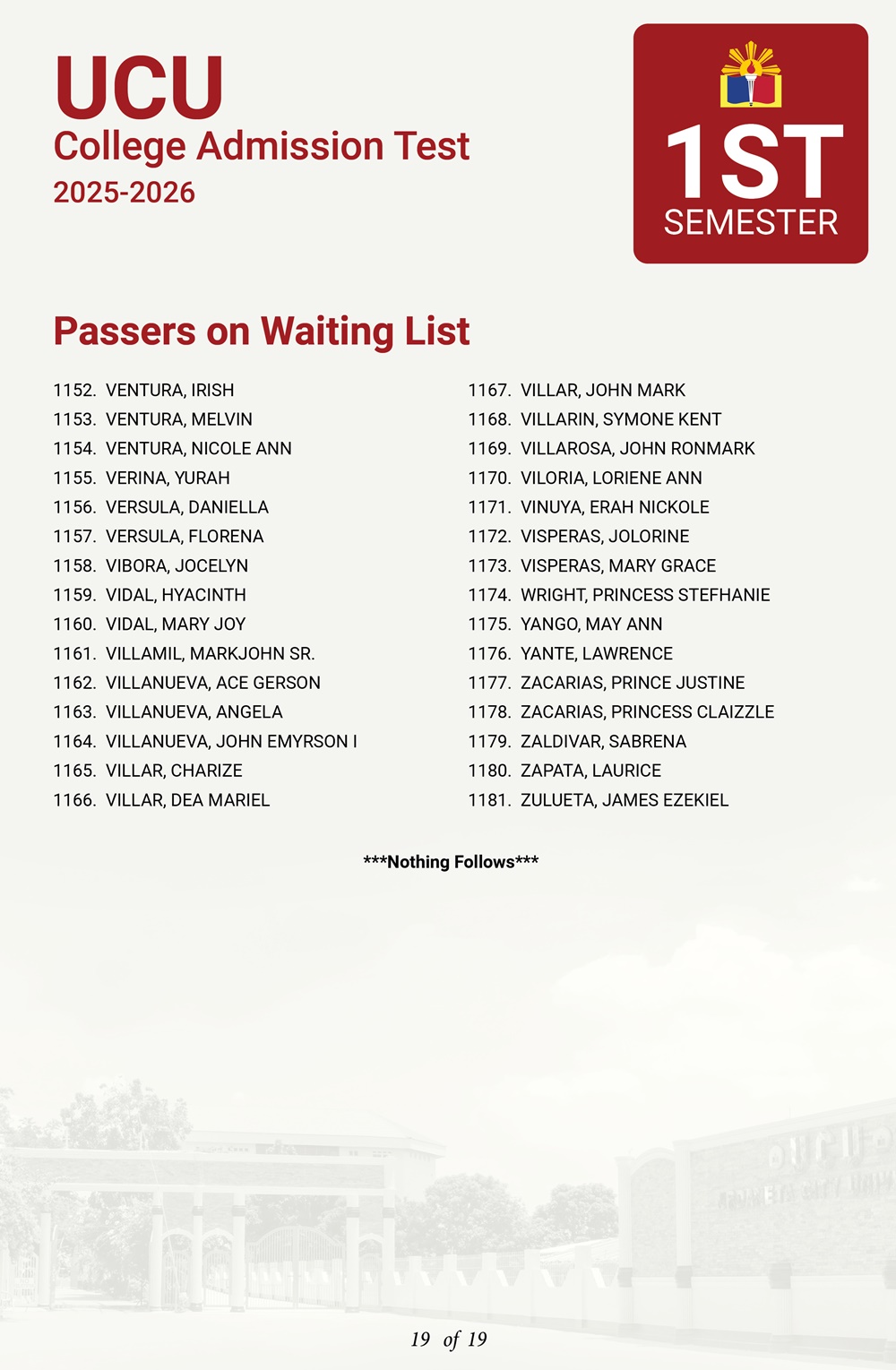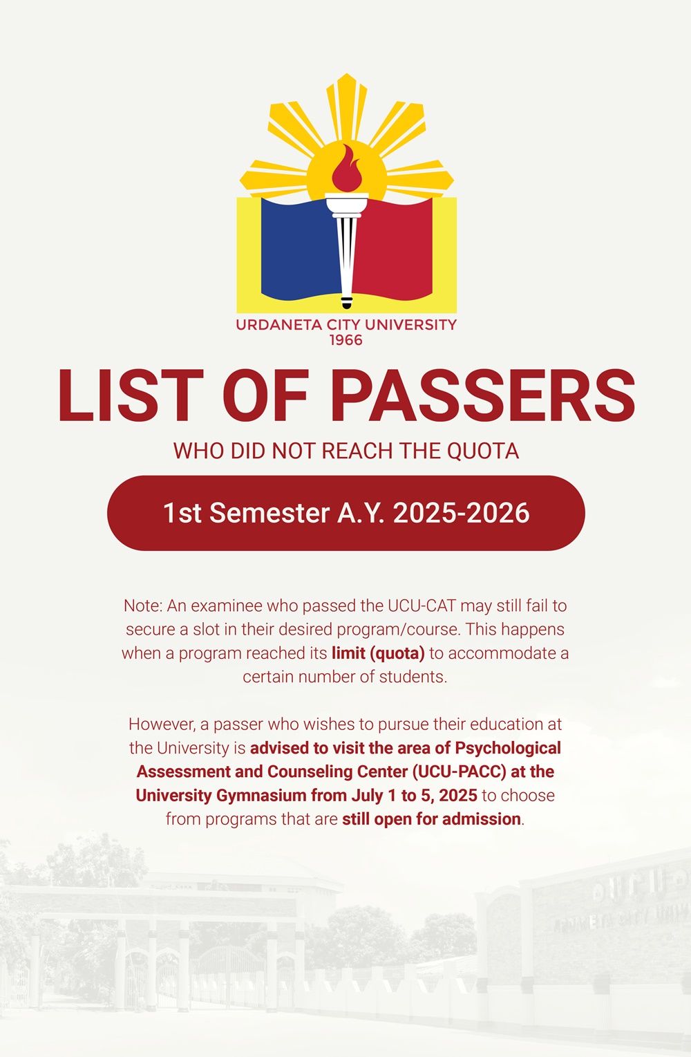 ATTENTION: UCU-CAT examinees for the First Semester, A.Y. 2025–2026 𝘸𝘩𝘰 𝘸𝘦𝘳𝘦 𝘯𝘰𝘵 𝘪𝘯𝘤𝘭𝘶𝘥𝘦𝘥 𝘪𝘯 𝘵𝘩𝘦 𝘧𝘪𝘳𝘴𝘵 𝘢𝘯𝘥 𝘴𝘦𝘤𝘰𝘯𝘥 𝘣𝘢𝘵𝘤𝘩 𝘰𝘧 𝘱𝘢𝘴𝘴𝘦𝘳𝘴— 𝘁𝗵𝗲 𝗪𝗔𝗜𝗧𝗜𝗡𝗚 𝗟𝗜𝗦𝗧 𝗳𝗼𝗿 𝗾𝘂𝗮𝗹𝗶𝗳𝗶𝗲𝗱 𝗮𝗽𝗽𝗹𝗶𝗰𝗮𝗻𝘁𝘀 𝗶𝘀 𝗻𝗼𝘄 𝗮𝘃𝗮𝗶𝗹𝗮𝗯𝗹𝗲.