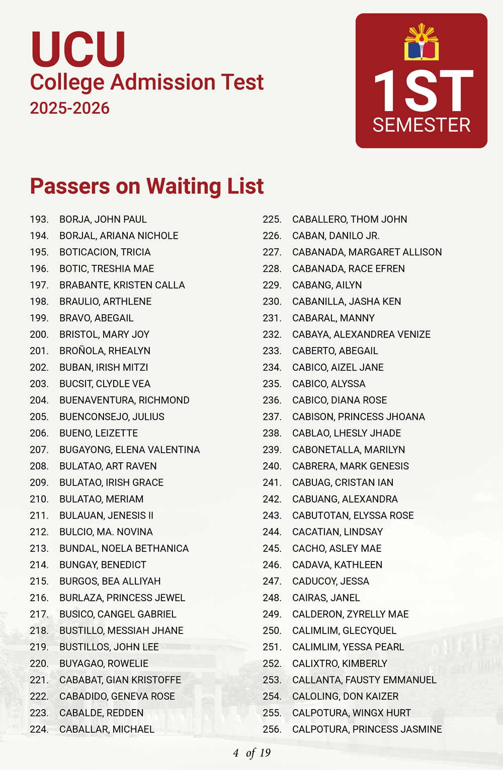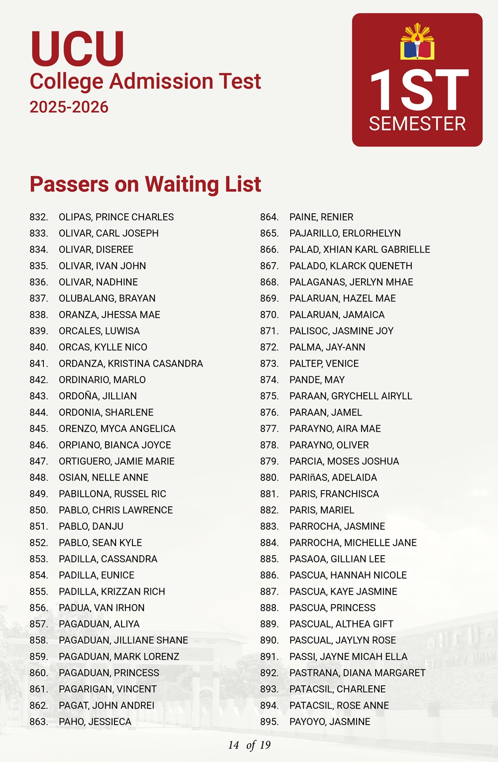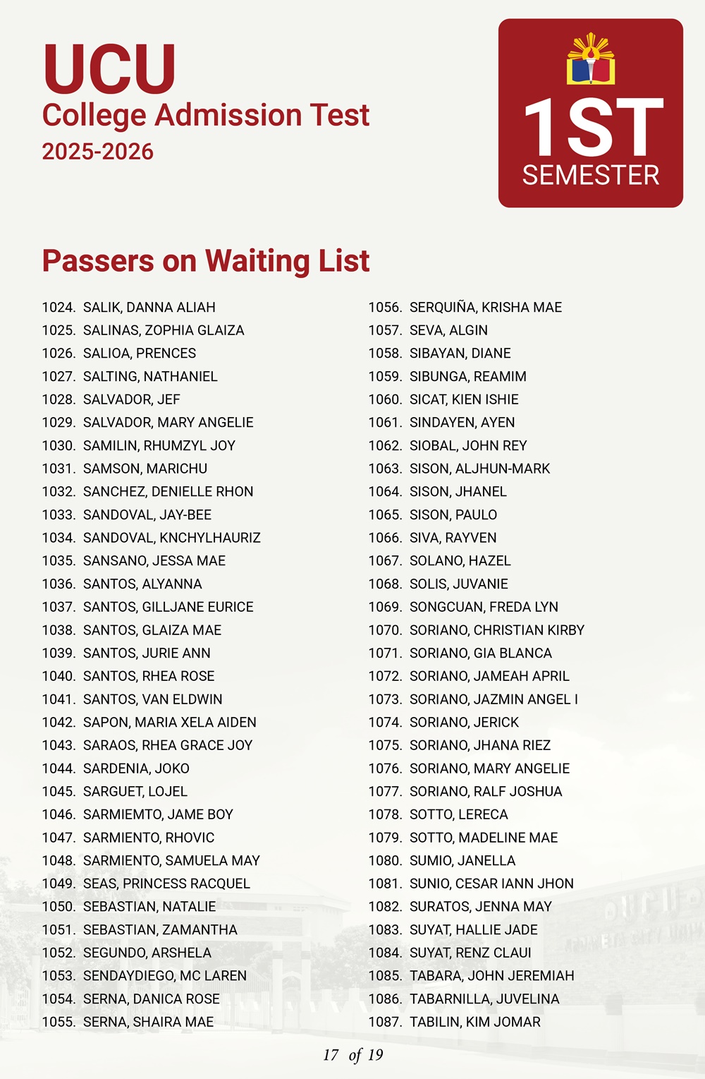 ATTENTION: UCU-CAT examinees for the First Semester, A.Y. 2025–2026 𝘸𝘩𝘰 𝘸𝘦𝘳𝘦 𝘯𝘰𝘵 𝘪𝘯𝘤𝘭𝘶𝘥𝘦𝘥 𝘪𝘯 𝘵𝘩𝘦 𝘧𝘪𝘳𝘴𝘵 𝘢𝘯𝘥 𝘴𝘦𝘤𝘰𝘯𝘥 𝘣𝘢𝘵𝘤𝘩 𝘰𝘧 𝘱𝘢𝘴𝘴𝘦𝘳𝘴— 𝘁𝗵𝗲 𝗪𝗔𝗜𝗧𝗜𝗡𝗚 𝗟𝗜𝗦𝗧 𝗳𝗼𝗿 𝗾𝘂𝗮𝗹𝗶𝗳𝗶𝗲𝗱 𝗮𝗽𝗽𝗹𝗶𝗰𝗮𝗻𝘁𝘀 𝗶𝘀 𝗻𝗼𝘄 𝗮𝘃𝗮𝗶𝗹𝗮𝗯𝗹𝗲.