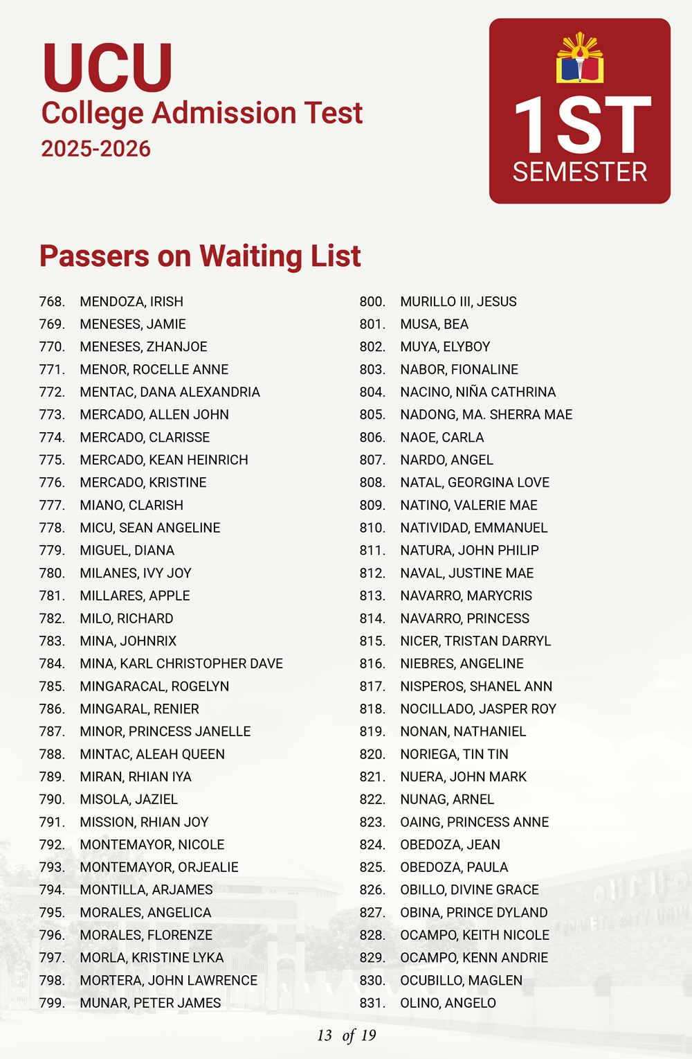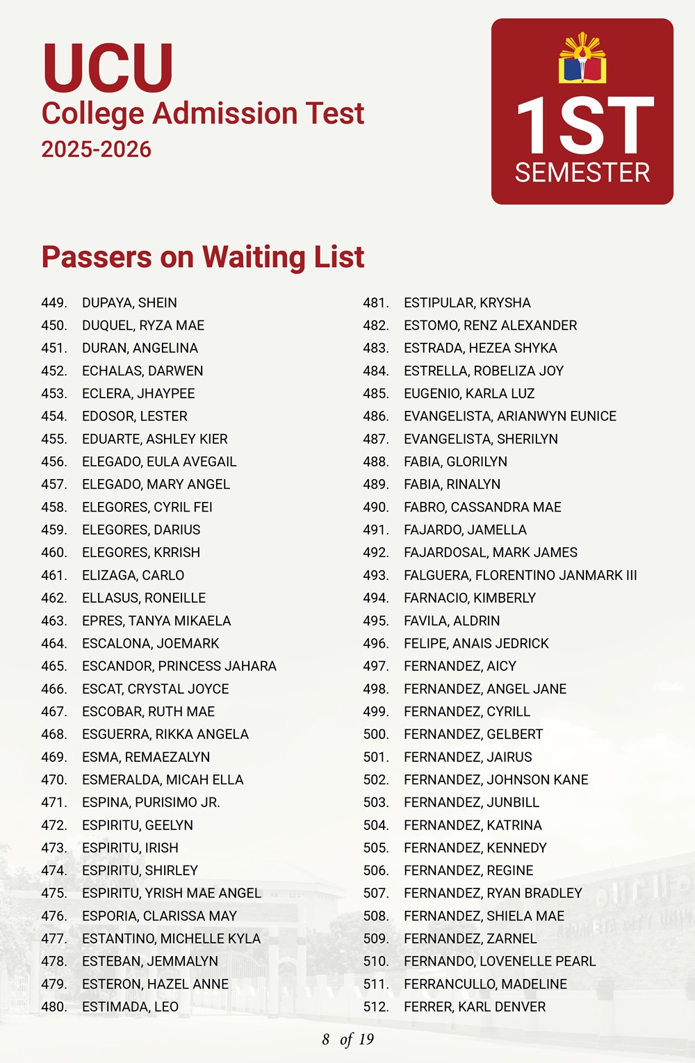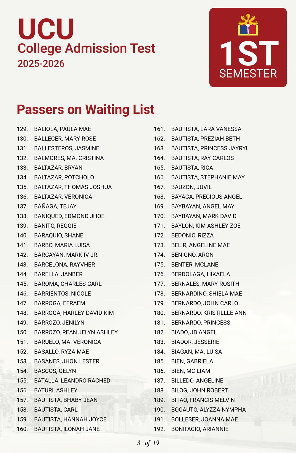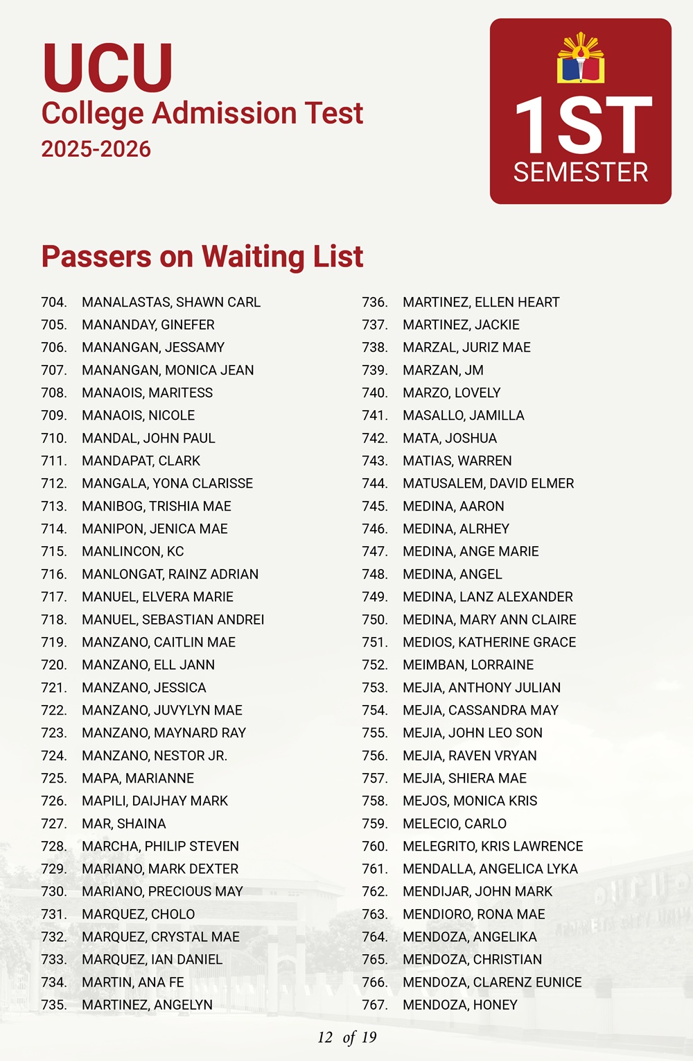 ATTENTION: UCU-CAT examinees for the First Semester, A.Y. 2025–2026 𝘸𝘩𝘰 𝘸𝘦𝘳𝘦 𝘯𝘰𝘵 𝘪𝘯𝘤𝘭𝘶𝘥𝘦𝘥 𝘪𝘯 𝘵𝘩𝘦 𝘧𝘪𝘳𝘴𝘵 𝘢𝘯𝘥 𝘴𝘦𝘤𝘰𝘯𝘥 𝘣𝘢𝘵𝘤𝘩 𝘰𝘧 𝘱𝘢𝘴𝘴𝘦𝘳𝘴— 𝘁𝗵𝗲 𝗪𝗔𝗜𝗧𝗜𝗡𝗚 𝗟𝗜𝗦𝗧 𝗳𝗼𝗿 𝗾𝘂𝗮𝗹𝗶𝗳𝗶𝗲𝗱 𝗮𝗽𝗽𝗹𝗶𝗰𝗮𝗻𝘁𝘀 𝗶𝘀 𝗻𝗼𝘄 𝗮𝘃𝗮𝗶𝗹𝗮𝗯𝗹𝗲.