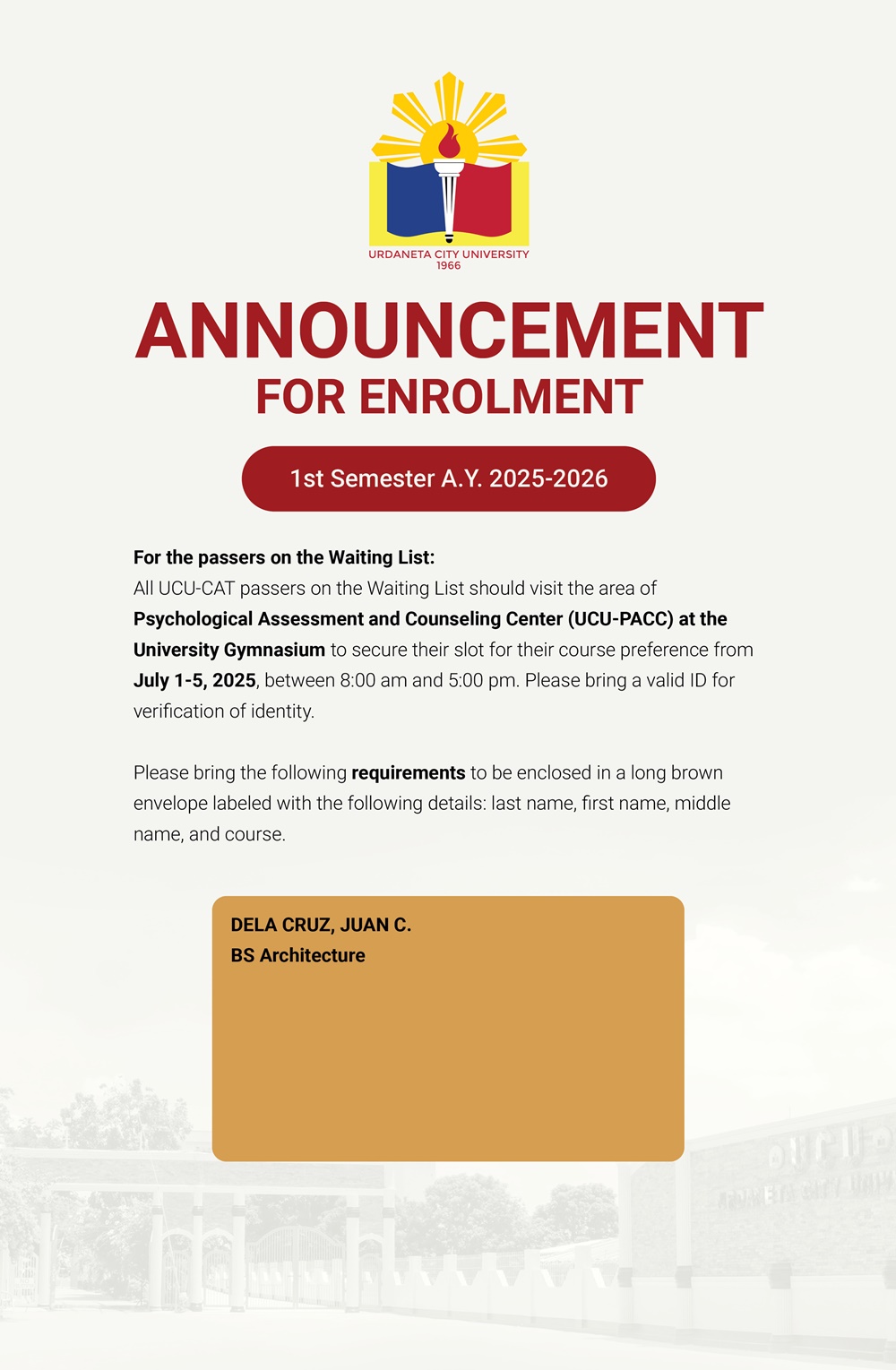 You are advised to visit the area of Psychological Assessment and Counseling Center (UCU-PACC) at the University Gymnasium from July 1 to 5, 2025 to choose from programs that are still open for admission. Kindly ensure you have the following documents ready: